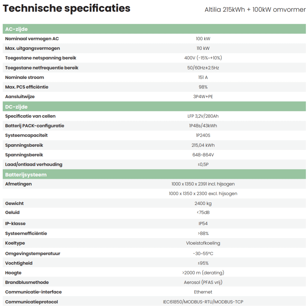 Het Altilia 215kWh energieopslagsysteem met 100kW omvormer is ontworpen voor bedrijven die niet alleen hun energie slim willen beheren maar ook willen besparen op energiekosten én willen verdienen met handel in stroom. Of het nu gaat om piekbelasting verlagen, zelf opgewekte zonne-energie optimaal benutten of profiteren van dynamische stroomtarieven – met dit systeem haalt u maximale waarde uit uw energie.
