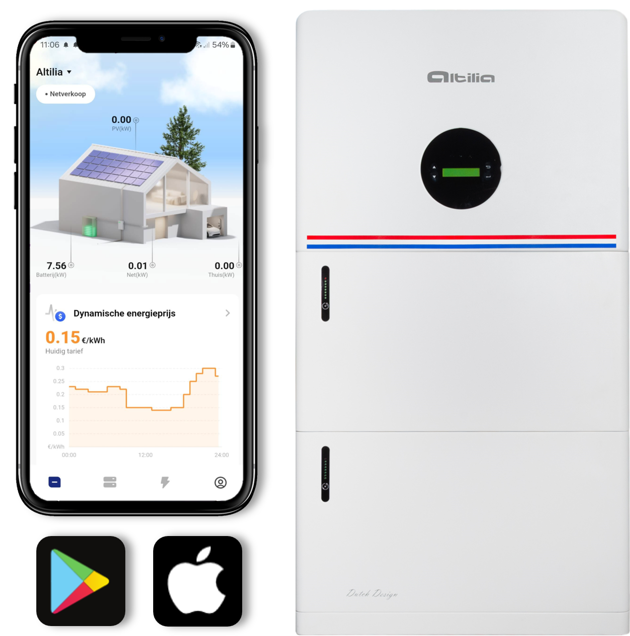 Met de Altilia All-in-One thuisbatterij haal je een complete, stijlvolle én intelligente thuisbatterij in huis met een prachtig Dutch design. De thuisaccu bevat zowel het batterijmanagementsysteem (BMS) als de omvormer en de batterijcellen in één slanke behuizing, wat ruimte bespaart én zorgt voor een razendsnelle, plug-and-play installatie. U bespaart maar liefst 50% op de installatiekosten. Uiteraard voorzien van Altilia’s super slimme Nederlandse AI-EMS-software. De software koopt automatisch stroom in bij lage prijzen, benut de opgeslagen energie optimaal en verkoopt overschotten op piekmomenten voor maximaal rendement.